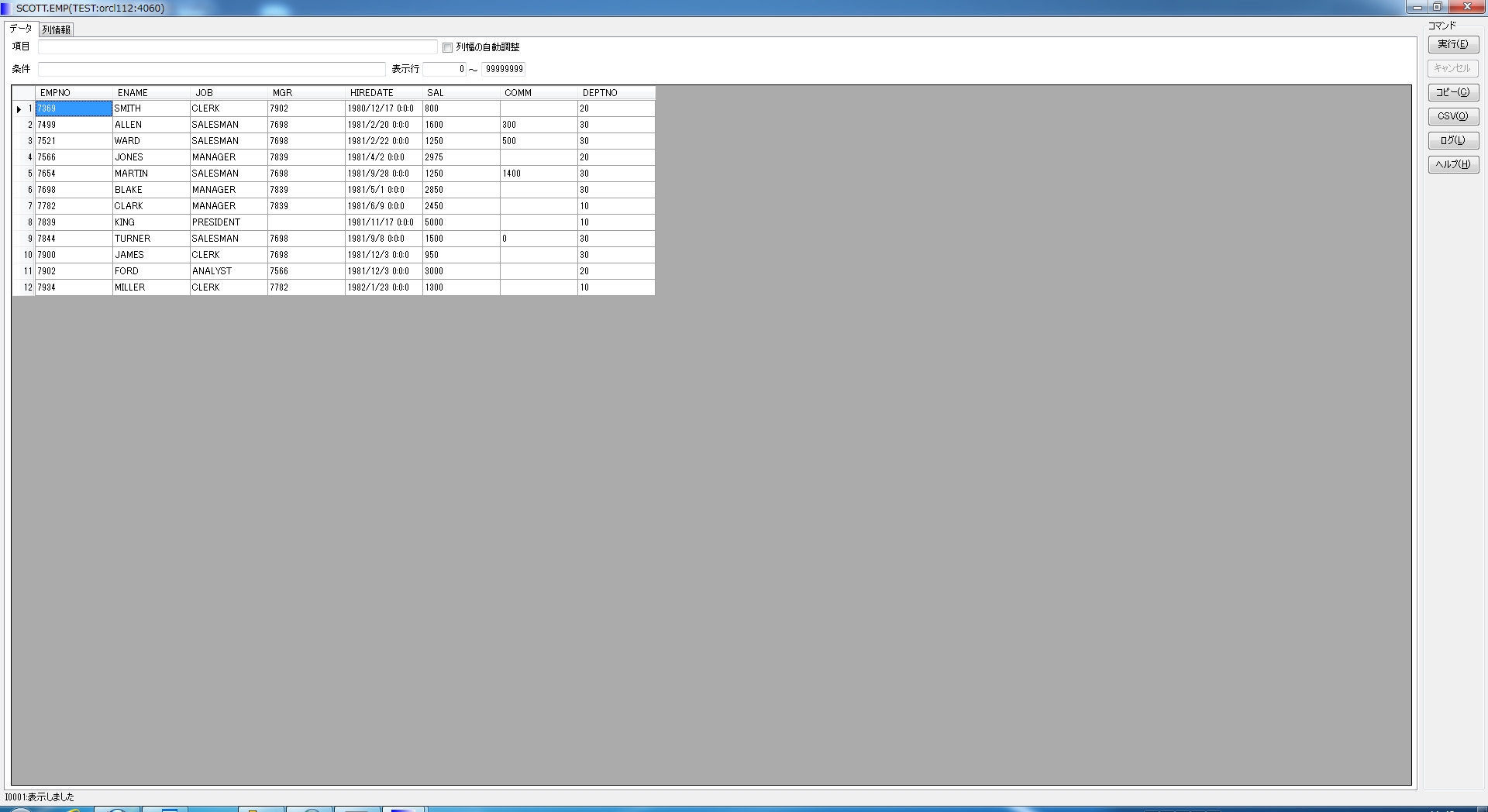 ・DATE型は「YYYY/MM/DD HH24:MI:SS」の形式で表示されます。・BLOB列をSELECTした場合「BLOB:<length>byte」というテキストデータが表示されます。